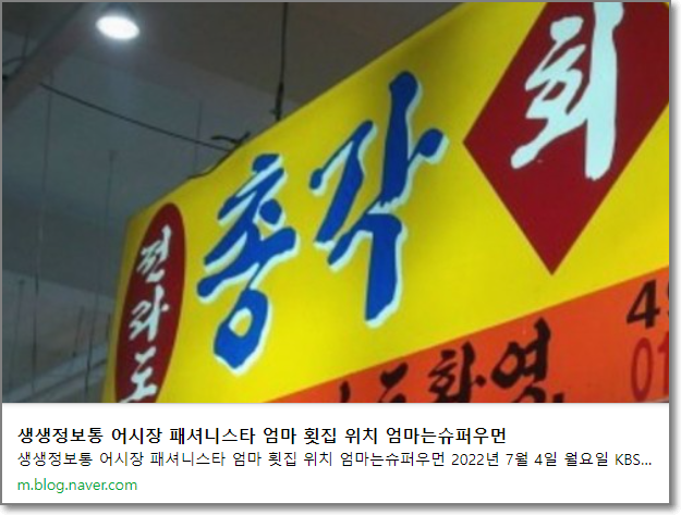 2tv 저녁 생생정보 방송에서는 어시장 패셔니스타 엄마 횟집이 소개됩니다.