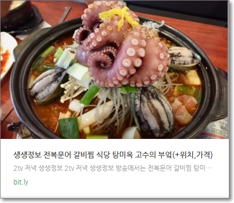 2tv 저녁 생생정보 방송에서는 전복문어 갈비찜 탕미옥이 소개됩니다.